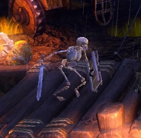 These Skeletons carry a broadsword and a large wooden shield and are more difficult to defeat than the Regular Skeletons. They just have the close combat ability but what they lack in ability they often make up in numbers. They are agile climbers and can jump quite a distance, making them difficult to evade in their relentless pursuit and attack.